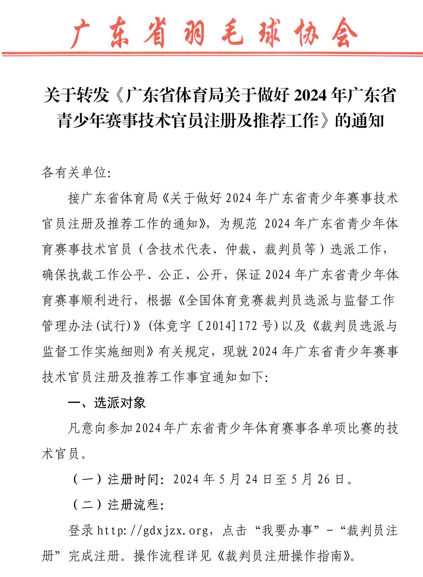 裁判通知|关于转发《广东省体育局关于做好2024年广东省青少年赛事技术官员注册及推荐工作》的通知 来源: 发布时间:2024-05-24 10:01:02 浏览次数: 次 【字体:小 大】 附件: 1. 《广东省体育局关于做好2024年广东省青少年赛事技术官员注册及推荐工作的通知》 2. 裁判员注册操作指南 3. 反兴奋剂线上教育准入系统操作指南 终审:linxiaoxiang 点赞 收藏 分享到: 【打印正文】