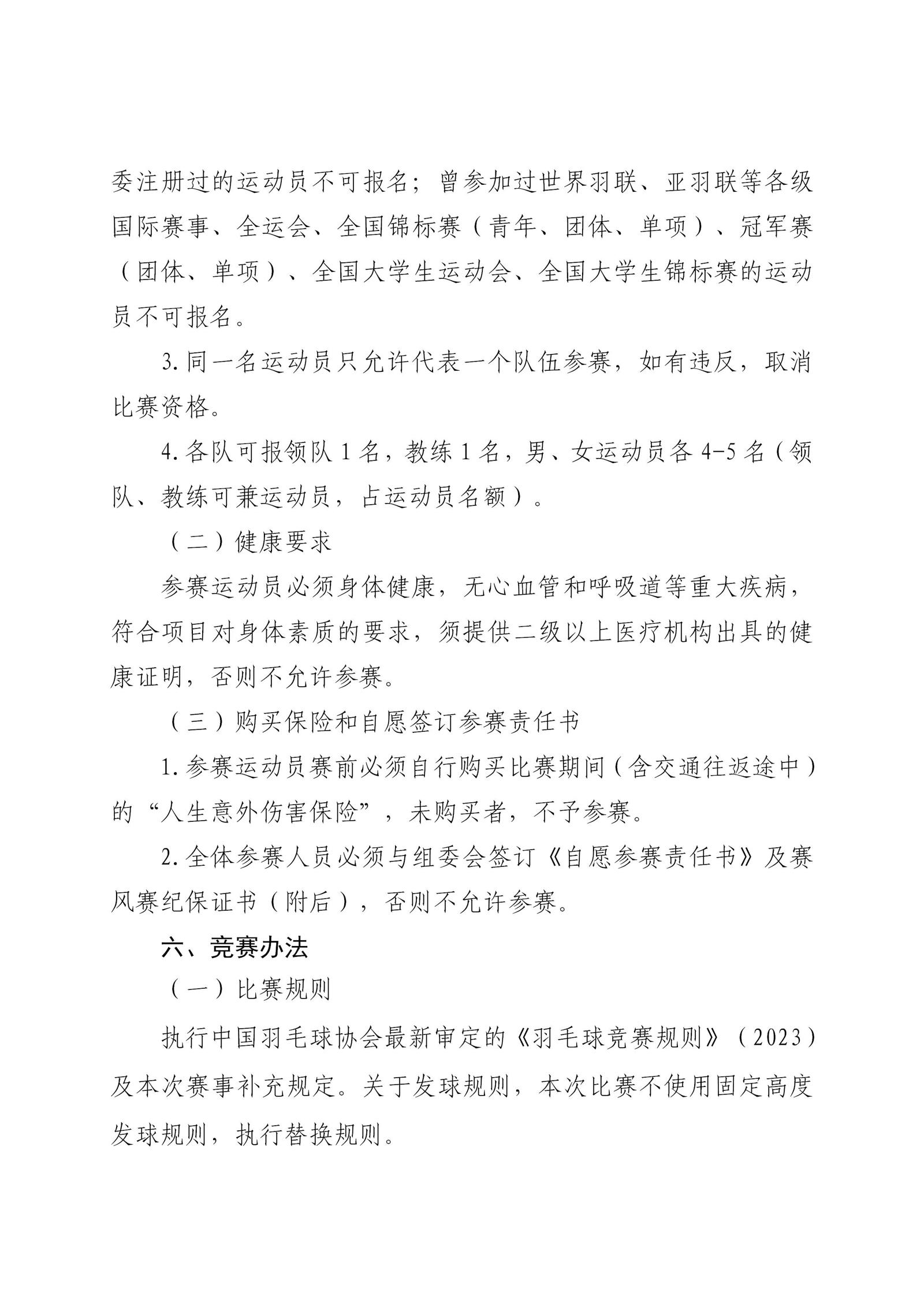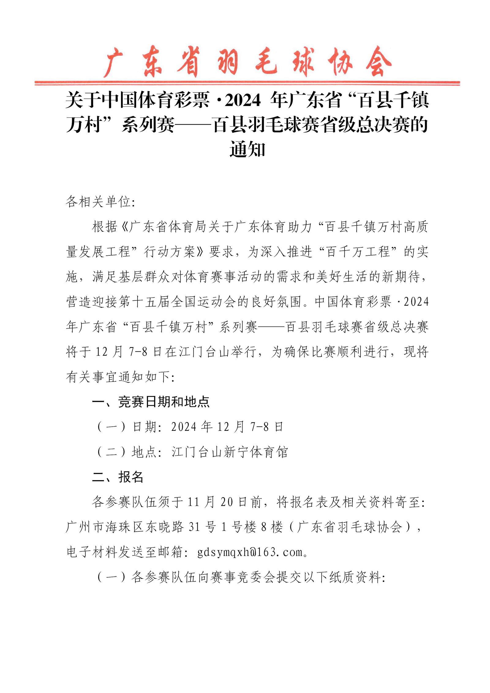 赛事通知 | 关于2024年广东省“百县千镇万村”系列赛——百县羽毛球赛省级总决赛的通知 来源: 发布时间:2024-11-05 14:27:03 浏览次数: 次 【字体:小 大】 附件:1.关于中国体育彩票·2024 年广东省“百县千镇万村”系列赛——百县羽毛球赛省级总决赛的通知.pdf2.《自愿参赛责任书》.pdf3.《赛风赛纪保证书》.pdf4.赛事报名表.docx5.运动队服装报备表.docx6.基础数据统计表.docx 终审:linxiaoxiang 点赞 收藏 分享到: 【打印正文】