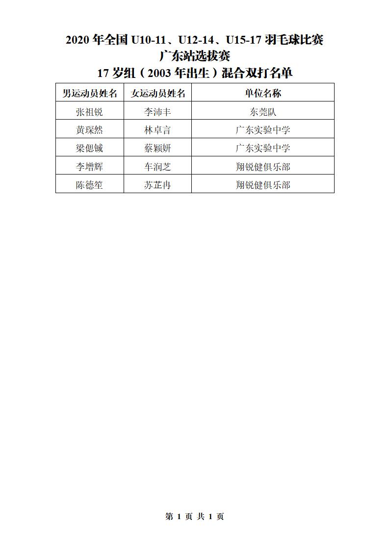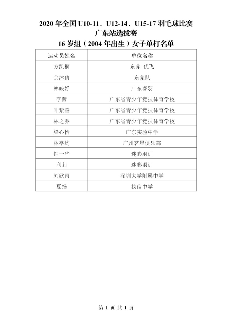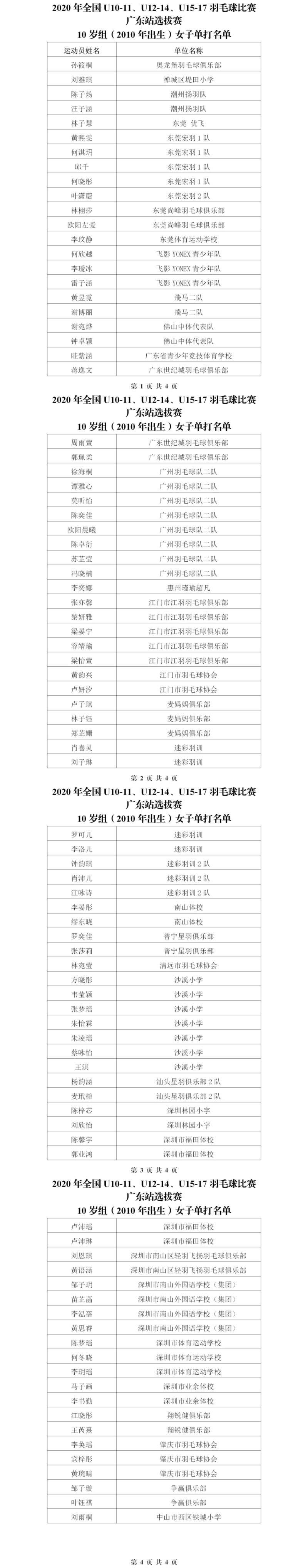 2020年全国U10-11、U12-14、U15-17羽毛球比赛广东站选拔赛运动员参赛名单 来源: 发布时间:2020-01-22 16:34:01 浏览次数: 次 【字体:小 大】 2020年全国U10-11、U12-14、U15-17羽毛球比赛广东站选拔赛运动员参赛名单 点赞 收藏 分享到: 【打印正文】