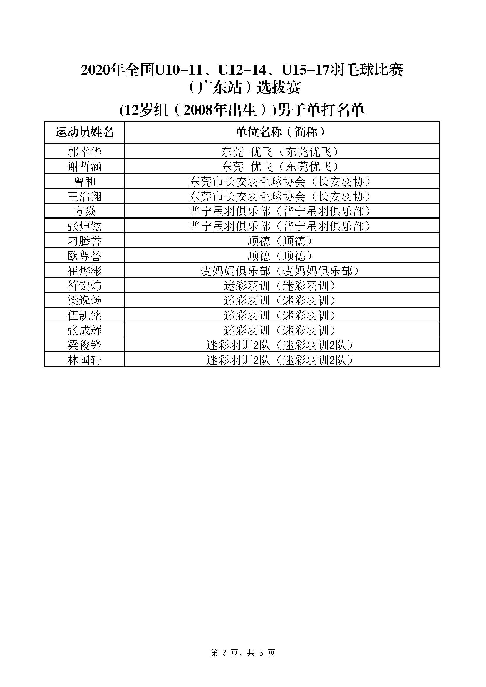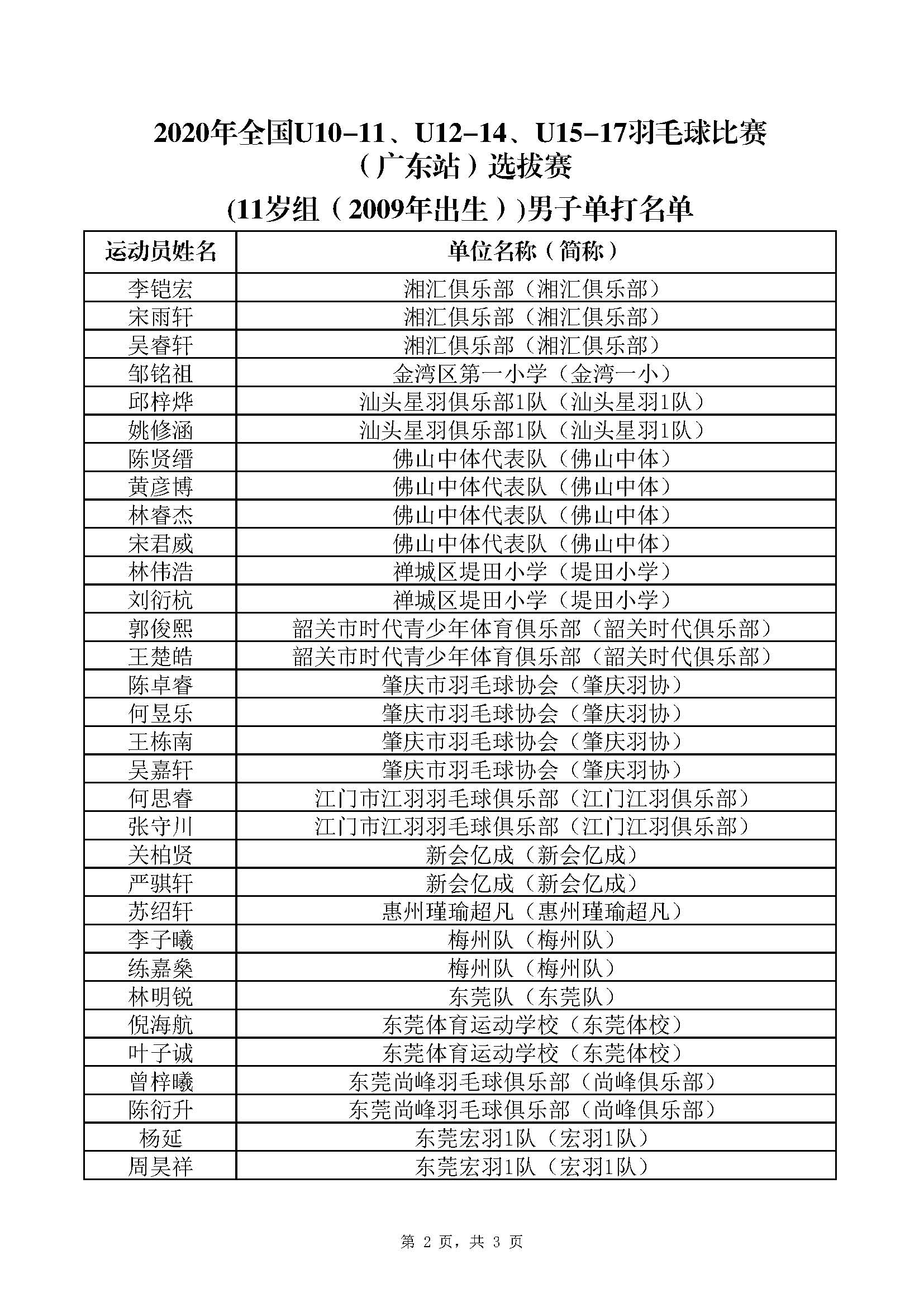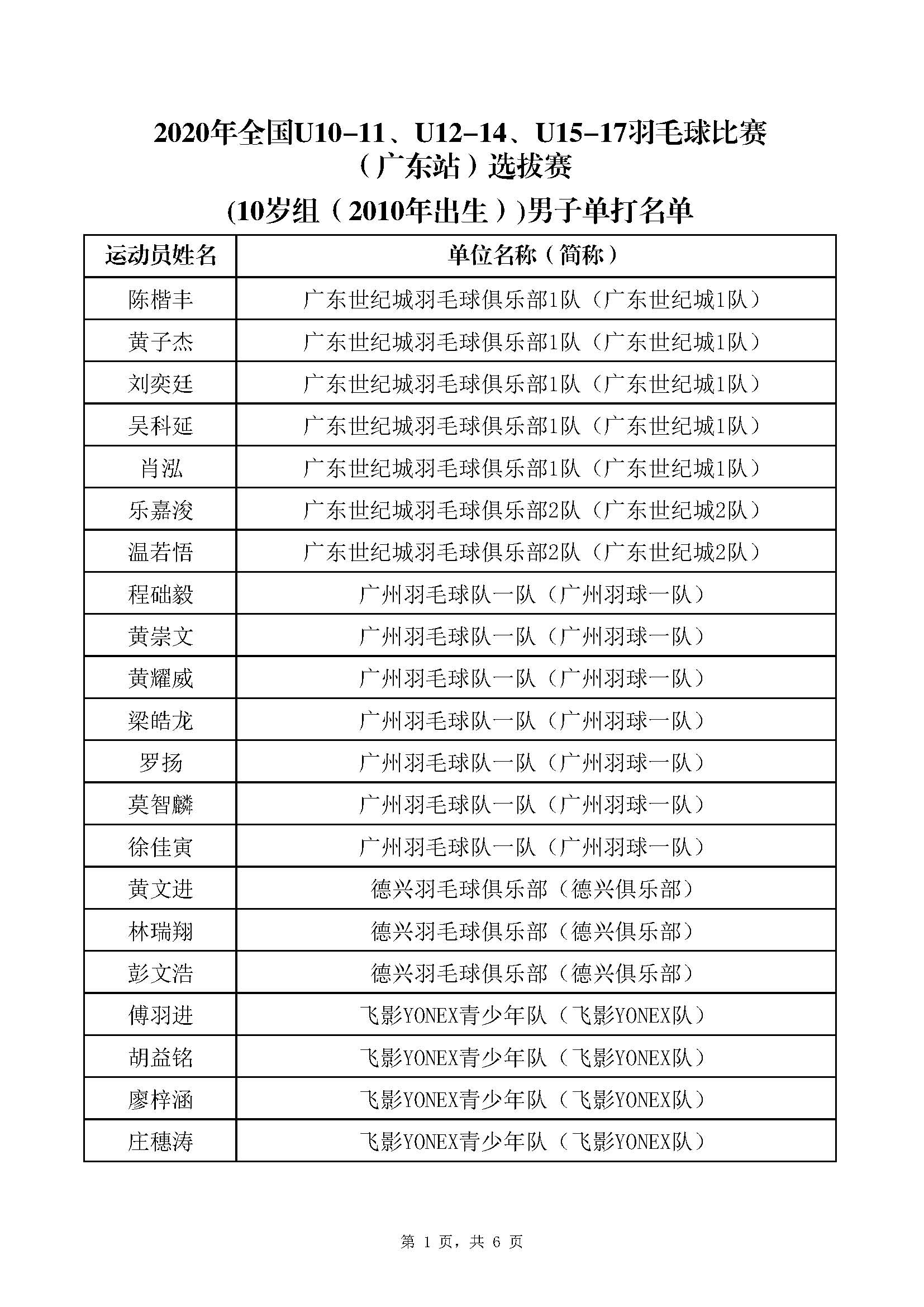 2020年全国U10-11、U12-14、U15-17羽毛球(广东站)选拔赛参赛运动员名单 来源: 发布时间:2020-07-24 10:06:04 浏览次数: 次 【字体:小 大】 点赞 收藏 分享到: 【打印正文】