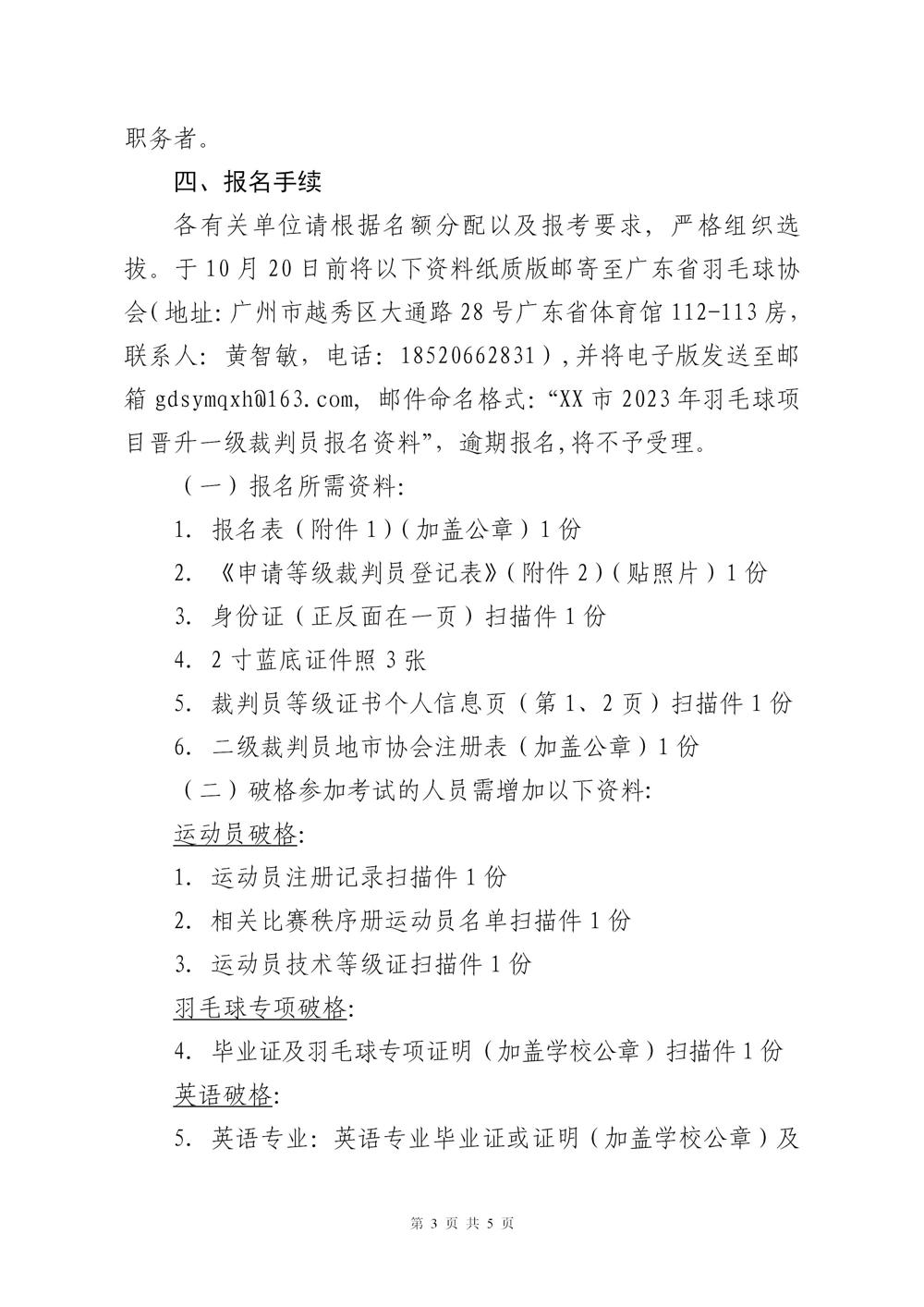 关于2023年广东省羽毛球项目晋升一级裁判员的通知 来源: 发布时间:2023-09-28 13:48:22 浏览次数: 次 【字体:小 大】 附件:关于2023年广东省羽毛球项目晋升一级裁判员的通知1. 2023年广东省羽毛球项目晋升一级裁判员培训考试报名表2. 《申请等级裁判员登记表》 终审:linxiaoxiang 点赞 收藏 分享到: 【打印正文】