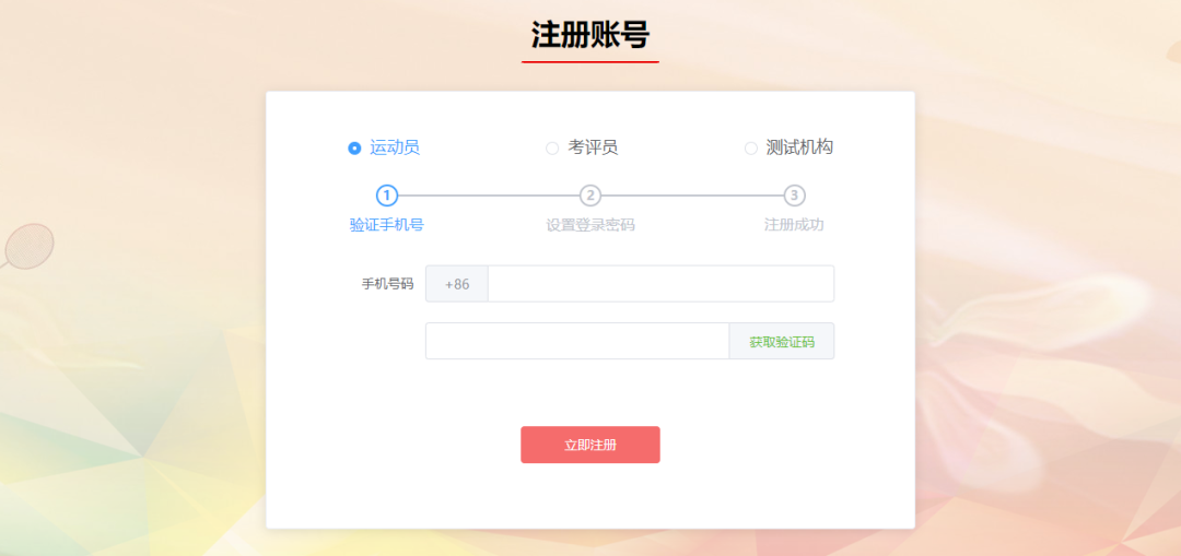 注册“运动员”账号,输入手机号、验证码点击注册。注册成功设置密码,并重新登陆。